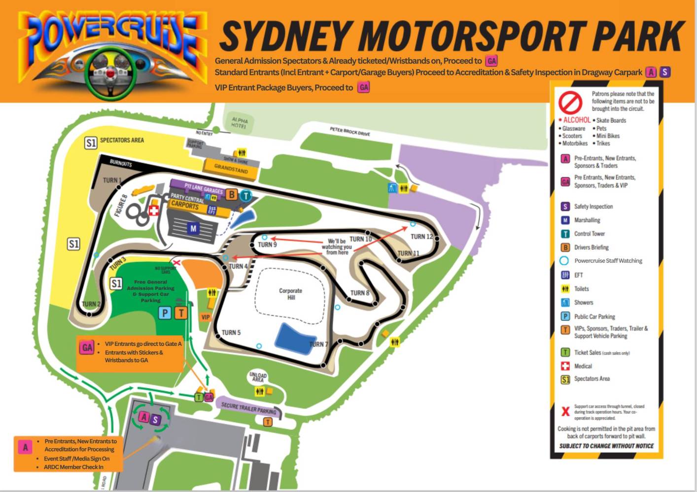 Powercruise is an alcohol free event.  The only acceptable blood alcohol reading for entrants at Powercruise is 0.00. Random breath testing will take place throughout the event.     Entrants are required to wear enclosed shoes while driving on the track.  For competition driving events including Off Street Racing, Drifting, Powerskids & Burnouts, all entrants are required to wear helmets, enclosed footwear and non-flammable clothing with full coverage from ankle to wrist to neck.  All Entrants/Participants are required to follow all Powercruise Staff and/or Official’s directions promptly and to full compliance.  Powercruise strongly recommends anyone who is pregnant, not participate in any on track activities in any way, and to seek their own medical advice.