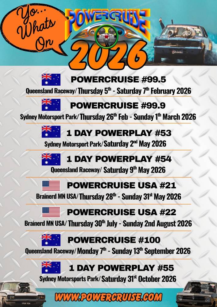 The 2026 calendar just dropped — and yep, it’s the year of the massive Powercruise #100, going down at Queensland Raceway, the home of Powercruise, right where it all began.